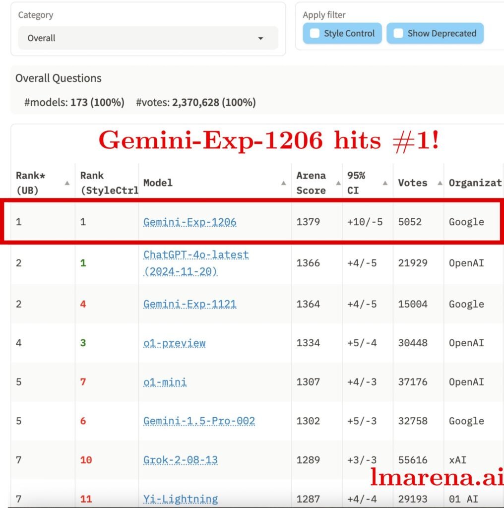1. First Place Overall: Gemini-exp-1206 has climbed from second to first, making it the best-performing AI model overall.